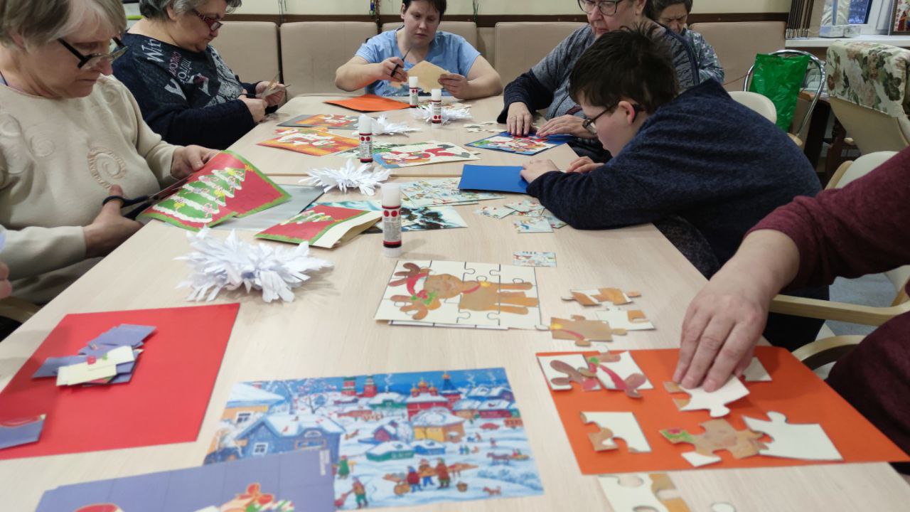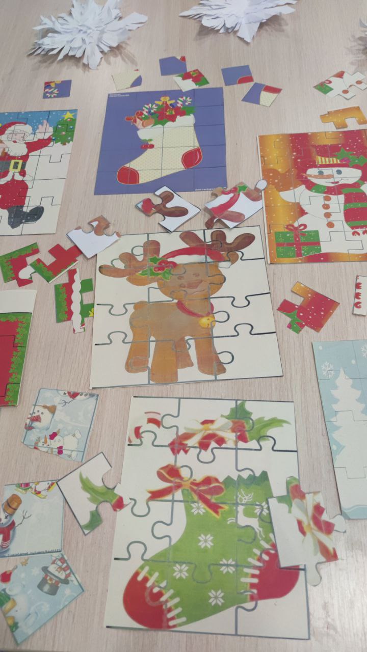 "Детский сад",- такое мнение выразили участницы мастер - класса, приступив к работе. Но процесс совместного творчества по изготовлению пазлов из картона, сборка из них ярких новогодних картинок оказался таким увлекательным и интересным, что время пролетело незаметно. А вид готовых изделий поднял настроение, и уже ни у кого не было сомнения в том, что детство может вернуться из "небывалого края чудес", напомнить о себе, принести радостные воспоминания, ощущение праздника. | |