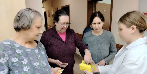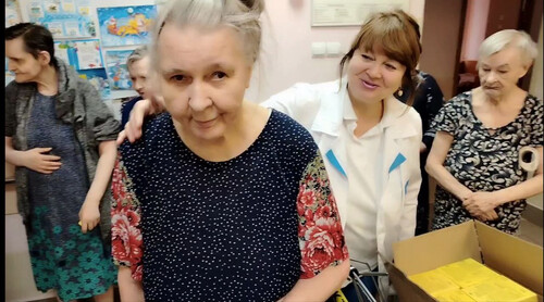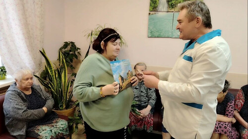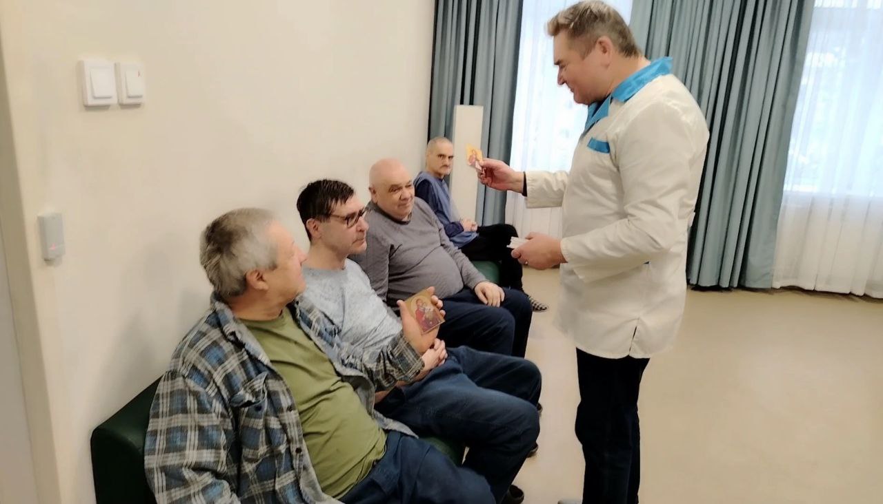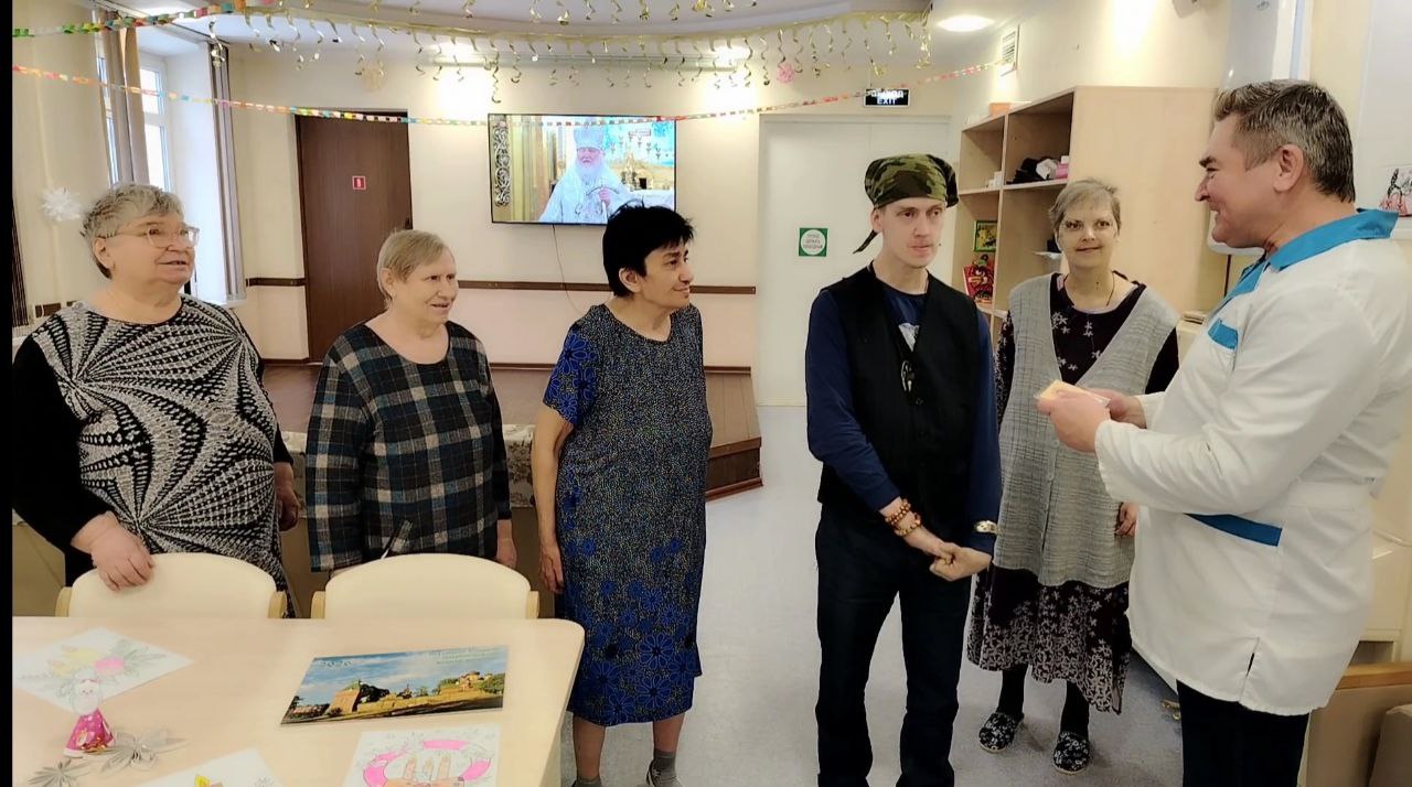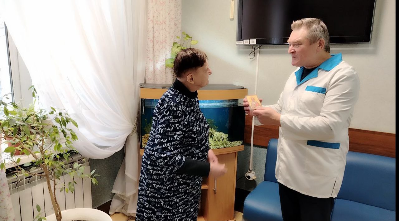 Атмосфера была полна света и доброты. Все вместе радовались , вспоминали светлые моменты своей жизни, общаясь друг с другом. Каждый из них получил небольшой, но очень важный подарок: освящённую икону, красочный настенный календарь и вкусную шоколадку.